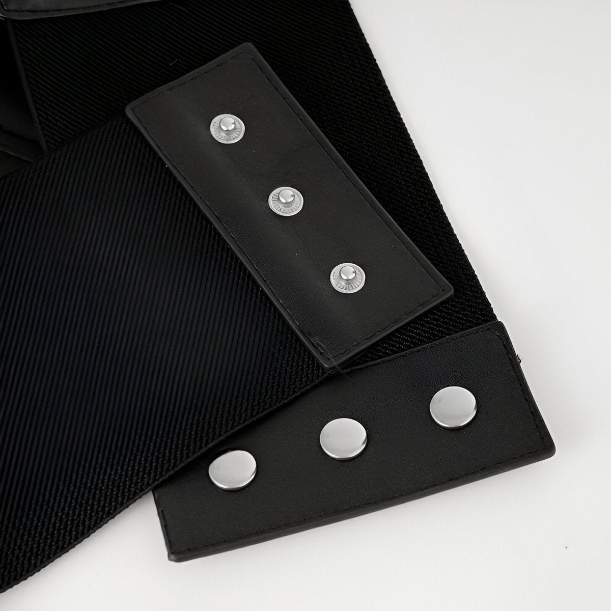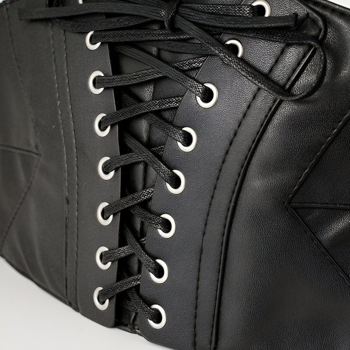 The Lesly Lace Corset Belt (Model Lesly) from Zictor embodies artisanal mastery and timeless elegance. Handcrafted in our workshops, it reshapes the silhouette with a restrained patchwork of lacings, balancing bold geometry with delicate detailing. Made in black vegan faux leather with an elastic strap, it is 15 cm wide (5.9 in) and 3 mm thick (0.1 in), delivering sturdy structure with comfortable wear.