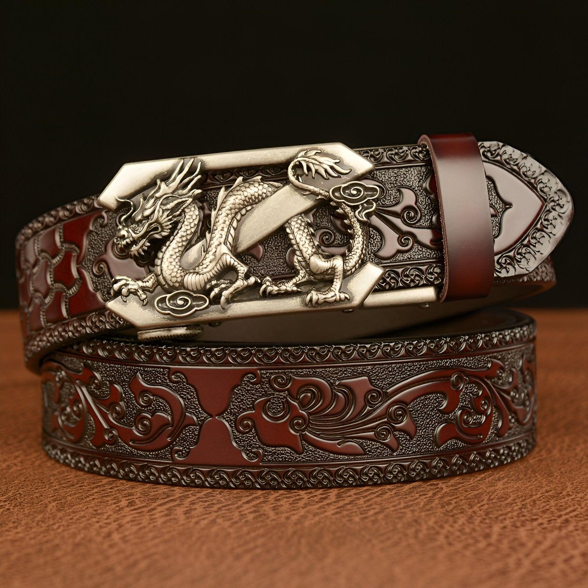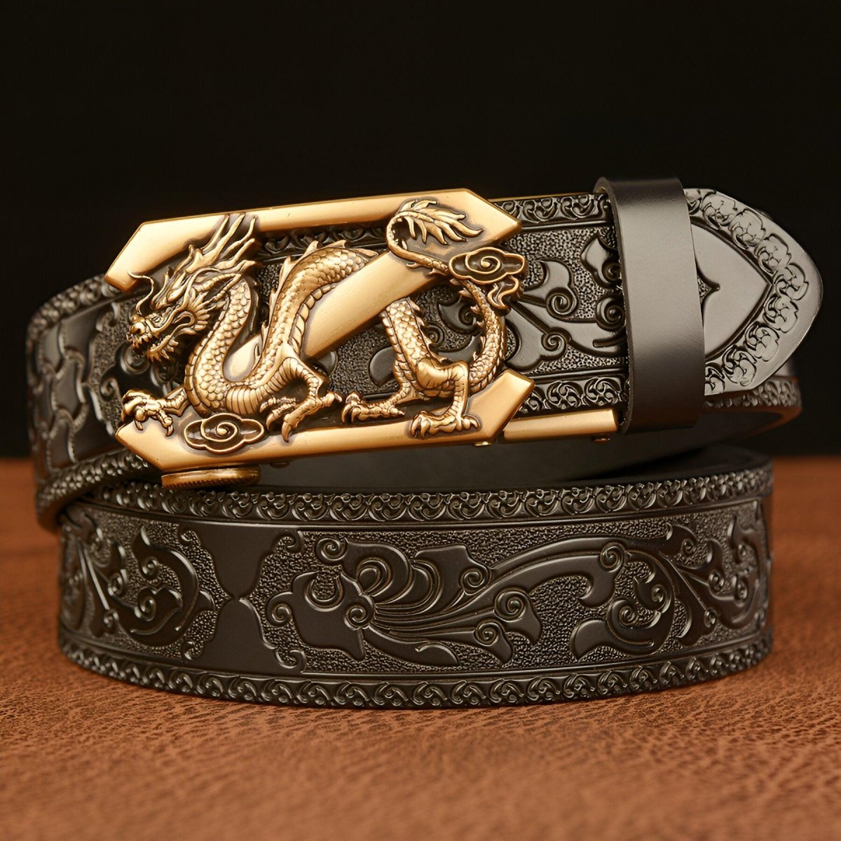 The Indie Dragon belt from Zictor is a limited-edition piece in the Esprit Animal line, blending heritage with modern luxury. The textured bovine leather strap is mineral-tanned in brown and black, 3.5 cm wide (1.4 in) and 3 mm thick (0.1 in). A golden rectangular automatic buckle, 7.8 cm long (3.1 in), features a dragon motif.