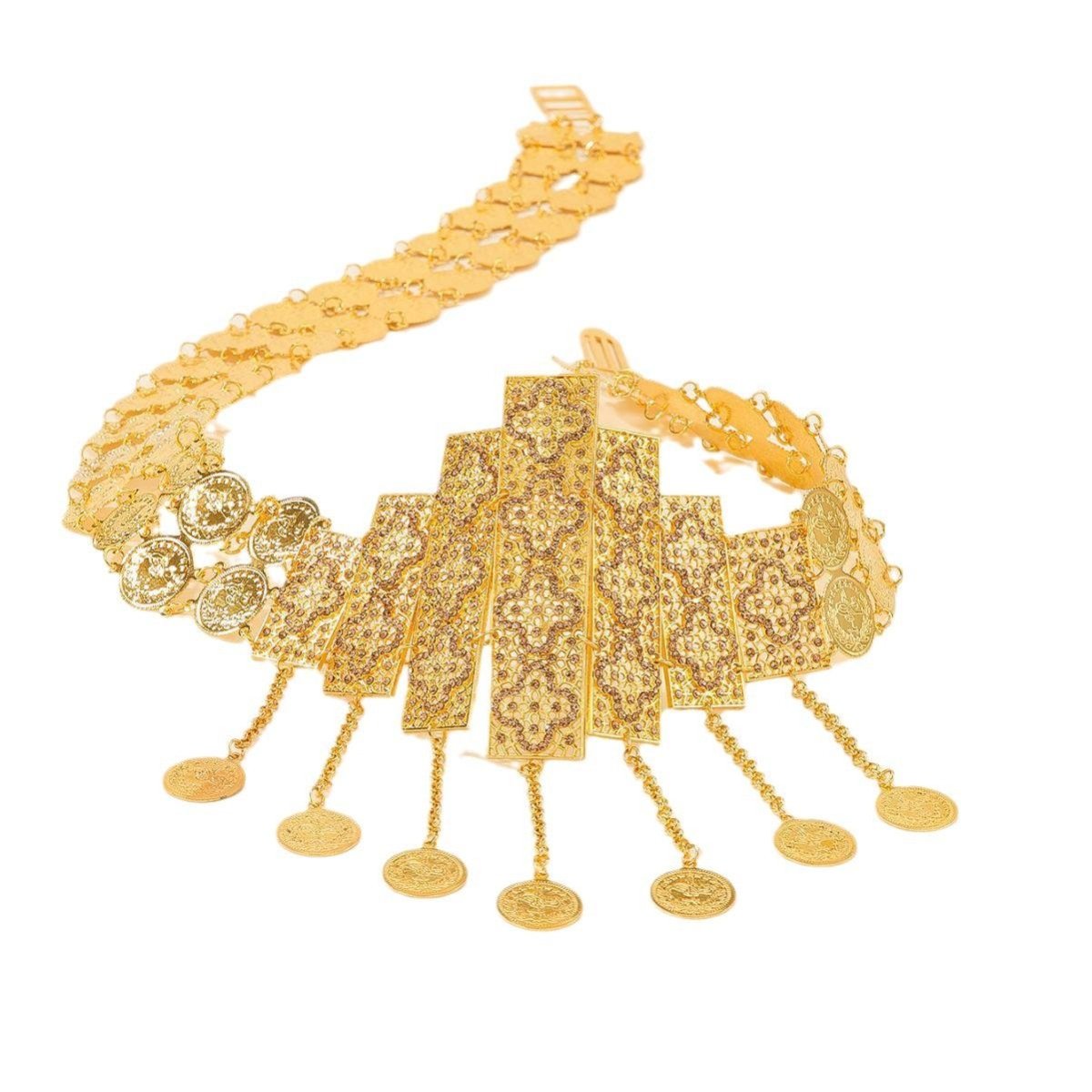 From Zictor, the Finlay belt fuses a geometric Xamira silhouette with Moroccan artisan charm. Handcrafted in a luminous golden alloy, it captures light and lends a prestigious presence to formal or ceremonial ensembles. The strap measures 17.0 cm (6.7 in) wide and 2 mm thick, engineered for durability without bulk. A gold oriental buckle with crochet clasp provides secure closure, while delicate pendants reflect expert craftsmanship and movement. This limited edition piece represents enduring luxury in a signature Zictor wardrobe.