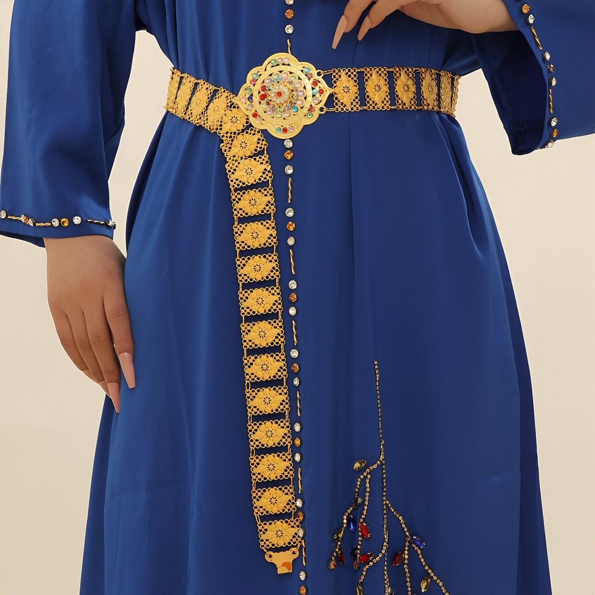 From Zictor, the Reid Latifa Moroccan belt embodies a refined fusion of ancestral technique and contemporary prestige. The central multi-colored jewel medallion recalls the mosaics of Alhambra, while Fez artisans craft the geometric golden motifs on a lustrous golden alloy strap. This limited-edition piece bears Zictor's provenance-led craftsmanship, delivering a quiet, unmistakable signal of taste for caftan, formal gown, or ceremonial attire.