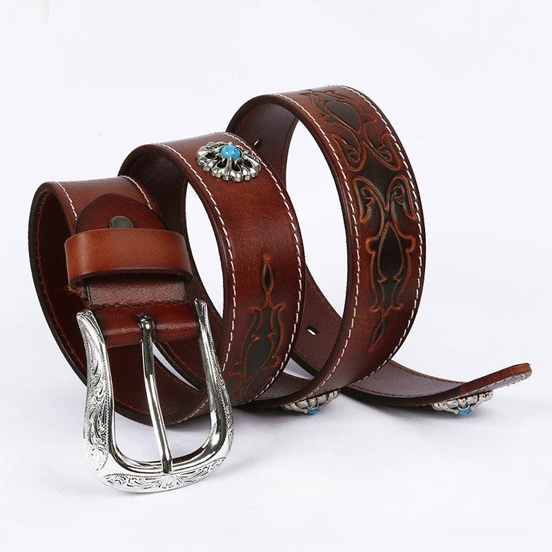 - Material and dimensions: Full-grain bovine crust leather; mineral tanning; deep brown; textured surface; embossed floral pattern; strap width 3.8 cm (1.5 in); buckle 6.0 cm × 5.0 cm (2.4 in × 2.0 in); turquoise centerpiece.